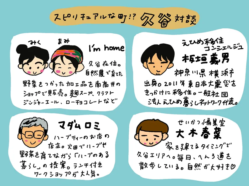 今回は、久谷生まれ・久谷在住の姉妹、まみさんとみくさん(「I'm home」店主)、久谷生まれ・久谷在住のマダムロミさん(ハーブティーのお店「マダムロミ」店主)、横浜市出身・松山市在住の板垣 義男さん(えひめ移住コンシェルジュ)に、愛媛県大洲市出身・久谷在住の大木 春菜編集長が、久谷エリアの魅力をうかがっています。