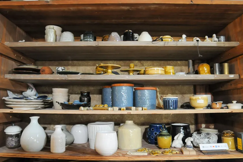 久谷の窪野町、里山の山あいに佇む古い一軒家に工房を構える陶芸家・宮内 太志さん。工房の窓越しに見える雑木林や雰囲気が自分の気分に合い、落ち着く場所。久谷のもう一つの良さは、移住してくる人を受け入れる風土、地域の明るさがあるという。宮内さんがつくる器には、小石や鉄粉、草木の根っこも混ざる土を好んで使い、釉薬(ゆうやく)も草木灰を自作し作陶している。工房は見学も可能、在庫は少ないが販売もしている。