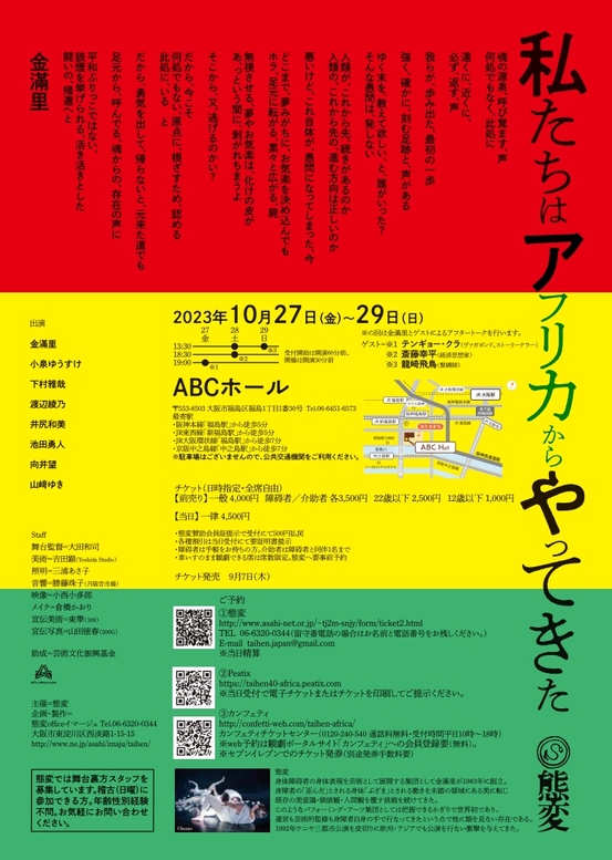 態変(代表:金滿里)主催、『私たちはアフリカからやってきた』が2023年10月27日 (金) ~2023年10月29日 (日)にABCホール(大阪府大阪市福島区福島1丁目1番30号)にて上演されます。