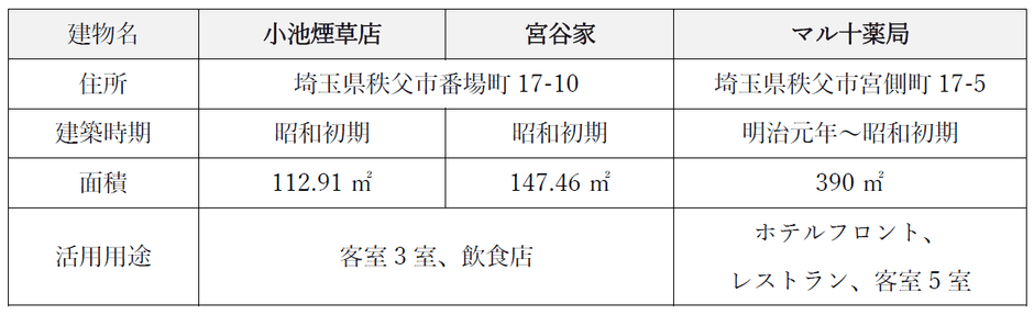 秩父エリアにおける古民家活用事業の第1期(以下、本事業)として、秩父まちづくりは、西武鉄道西武秩父駅周辺エリアに点在する「小池煙草店(登録有形文化財)」「宮谷家(小池煙草店に併設)」と「マル十薬局」3件の改修に取り組む計画で、レストランやカフェを併設した宿泊施設として再生、秩父市の新たな観光拠点とすべく2022年春頃のオープンを目指して事業を進めています。本施設は3棟で1つの分散型ホテルであり、地域内にホテル機能や客室が点在することで滞在客の地域内回遊を生み出します。
