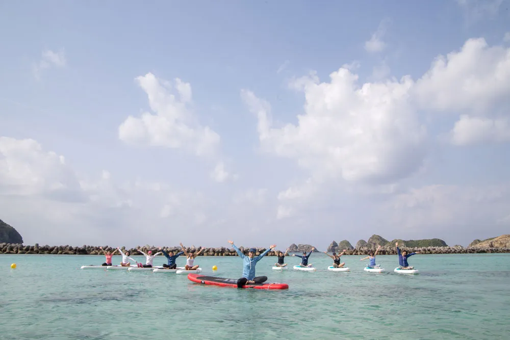 阿嘉島の美しい海の上で行う、SUPヨガ。呼吸を整え、バランス感覚を養い、体幹を鍛えます。ほとんど全員が初めての体験でしたが、大人も子どもも参加できるアクティビティに、みなさん笑顔があふれていました。その後はグループに分け、SUPミニレース。白熱したゲームとなりました。