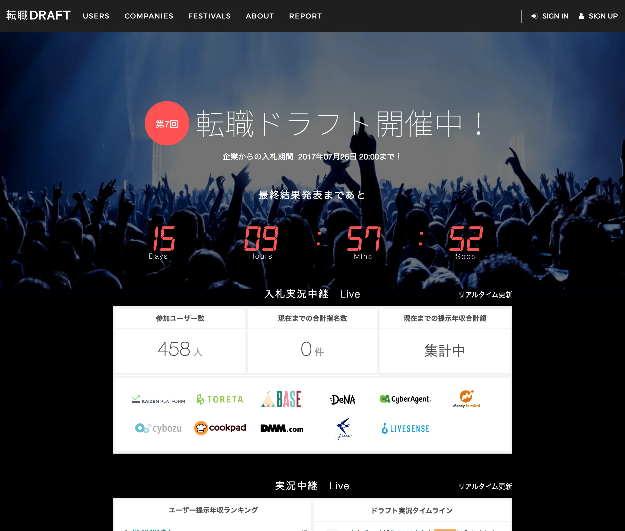「プロスポーツの選手獲得時に行われるドラフト会議のように、ITエンジニアをWebサイト上でドラフト指名(競争入札)するサービスが転職ドラフトです。参加者(ITエンジニア・企業)は、他のITエンジニアや他企業の入札結果を閲覧することも可能で、ITエンジニアのリアルな市場価値を把握することができます。転職ドラフトを通じて、全てのITエンジニアが市場評価によって適正に評価され、より一層『プロ』として活躍できる世界をあたりまえにしていきます。」