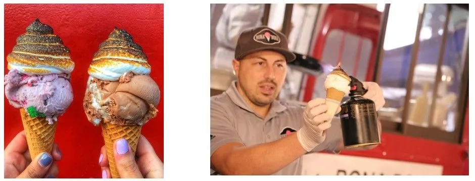 元シェフのニック・ディ・ボナ氏が生み出す独創的なアイスクリーム。こだわりの材料で作ったアイスクリームの上にマシュマロを絞り、バーナーで焦がして完成。スモーガスバーグでは女性に大人気。ボナ氏はアメリカの食専門チャンネルの人気番組「Chopped(チョップド)*」で優勝したことでも話題に。