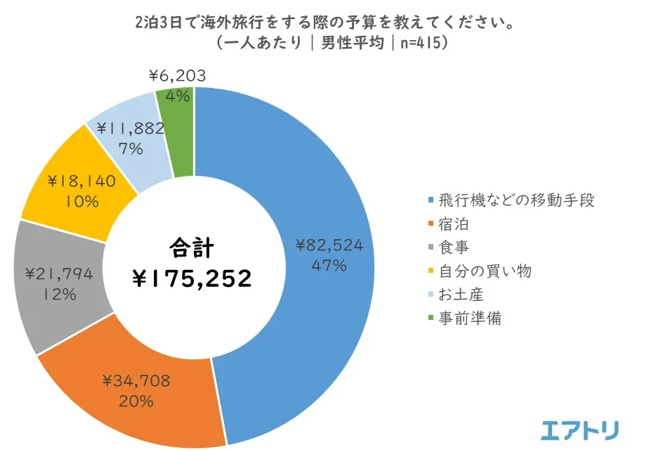 海外旅行(2泊3日)の平均予算は、男性が 175,252円、女性が 145,066円と、男性が女性を約3万円上回りました。国内旅行と同様に、「飛行機などの移動手段」(男性82,524円 女性61,467円)と、「宿泊」(男性34,708円 女性24,875円)の2項目において、男性が女性を大きく上回る結果となりました。また、「自分の買い物」(男性18,140円 女性24,705円)が唯一、女性が男性を上回りました。