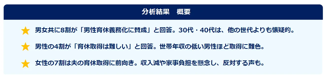 株式会社Insight Tech(本社:東京都新宿区、代表取締役社長:伊藤友博)は当社が運営する「不満買取センター」上で、「男性育休義務化」をテーマについてアンケートを実施。男女2,993名から回答を得て、解析ツール「ITAS」で解析を行ないました。以下、結果をご報告いたします。