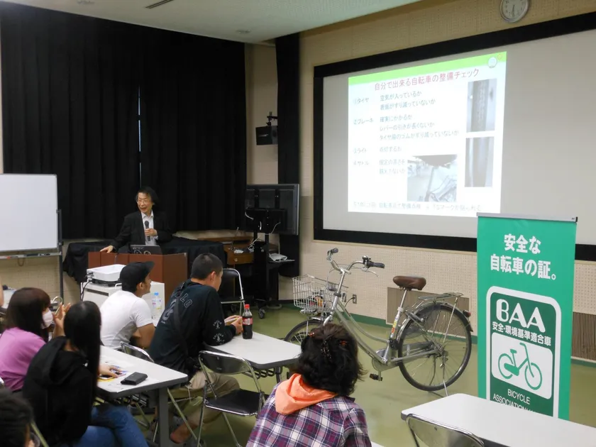 交通安全教室の中で、谷田貝 一男氏は危険運転の動画や事故事例などを用いながら、「自転車事故を起こさない・加害者にならないためには、どうして自転車事故を起こしてしまうのかをきちんと考えることが重要です。また暗い時間帯に自転車に乗る前には、必ずライトが点灯するか、リフレクターがついているか確認しましょう。また、中高生の自転車事故の中には自転車の車体が原因となった事故もあります。通学用の自転車はBAAマークなどの安全マークが付いた自転車を選ぶと安心です。」と話しました。