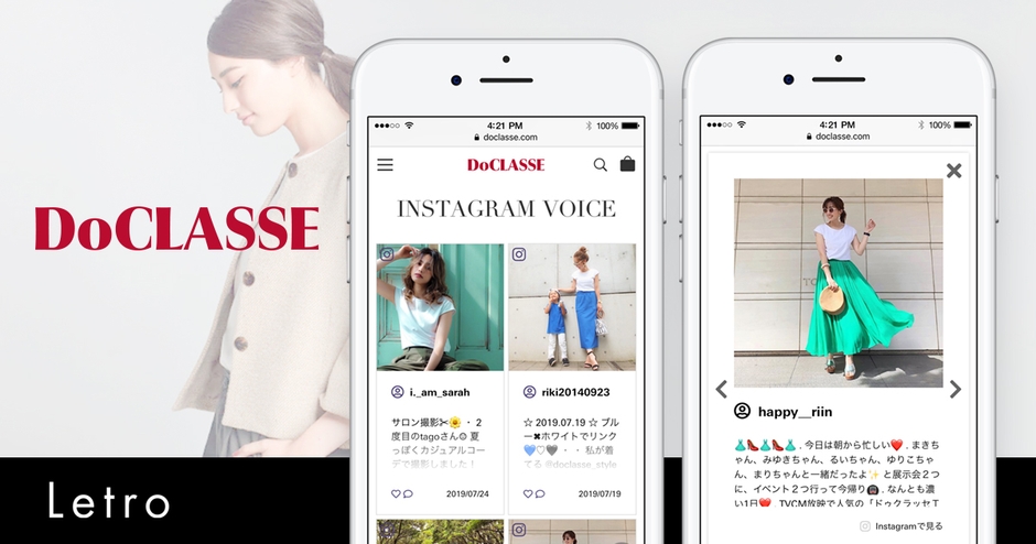 そして投稿数を増やすだけではなく、Instagram上に生まれたUGCを活用して、ユーザーをサイトへ誘導し、CVRの向上、客単価の向上のために、当社のSaaS型クリエイティブプラットフォーム「Letro」を導入し、ユーザーの投稿をECサイト上に掲載する施策を行いました。