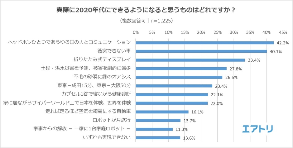 ―1位の「ヘッドホンひとつであらゆる国の人とコミュニケーション」でも42.2%、「いずれも実現できない」と回答した人も13.6%いました。
