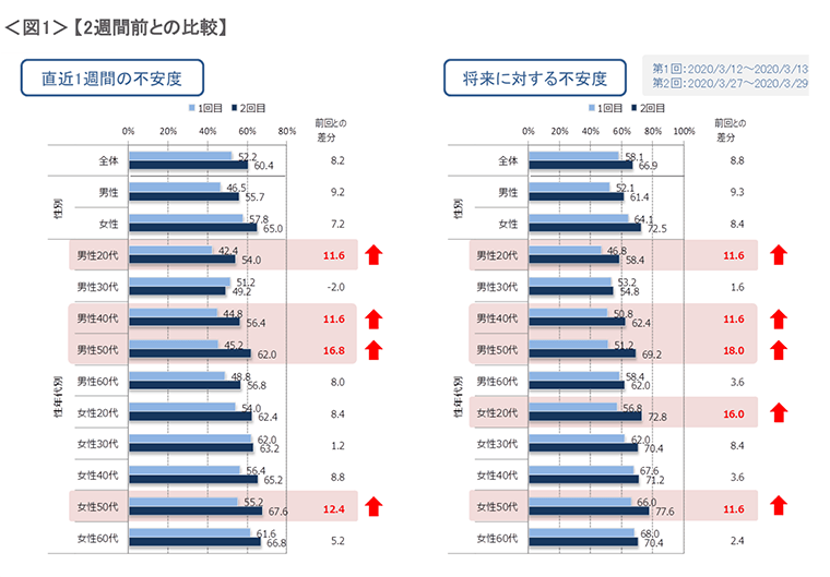 【直近1週間の不安度】は、全体で2週間前より8ポイント上昇。10ポイント以上増えたのは「男性20代」「男性40~50代」「女性50代」。【将来への不安】では、全体で9ポイントの上昇。「男性20代」「男性40~50代」「女性20代」「女性50代」は10ポイント以上増加。 「不安度」や「将来の不安」は、男性より女性が、年齢が上の方で高い傾向にあるのは2週間前と変わらない。不安の低かった20代(特に男性)は、約10ポイント上昇と高まりが目立った。<図1>生活必需品がなかなか購入できないことから、若い層での不安感が高まったと考えられる。