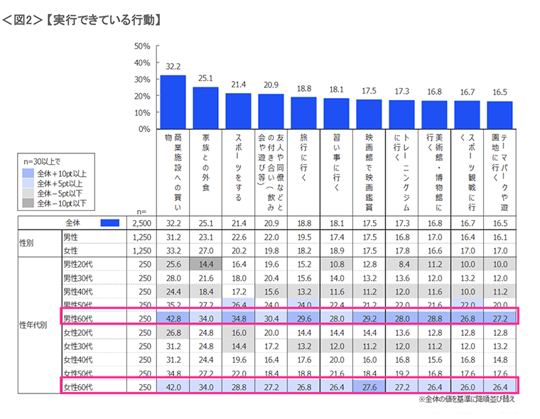【呈示したアクティビティに対し、現在どの程度実行できているか】を聞く質問では、全体で「商業施設への買い物」32.2%、「家族との外食」25.1%、「スポーツをする」21.4%、 「友人や同僚などとの付き合い(飲み会や遊びなど)」20.9%が主なもの。年代別にみると男女ともに不安感の高い60代が他年代より行動しているという結果であった。 年齢が若いほど実行している行動は少ない。 <図2>実施した行動について、エリア別の差はなかった。60代は「自分は高齢者」と思っている人が少なく、自粛要請のない平日の日中の行動が可能な点から、他層より行動が多いのではないかと推察される。