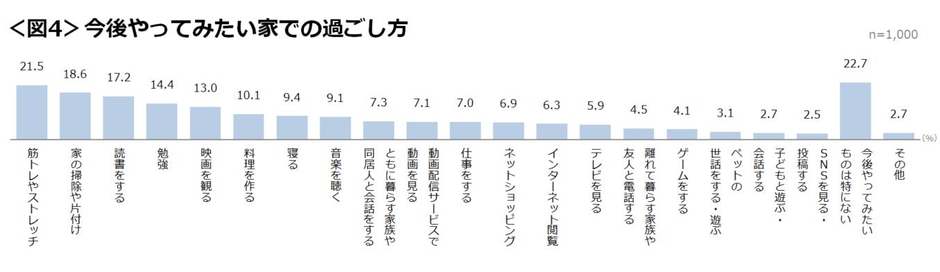 ☑ 今後やってみたい家での過ごし方では「筋トレやストレッチ」(21.5%)が最も多く、外出制限でのマイナス要因である運動不足やストレス解消のために行いたいと思う人も多いとみられる。<図4>