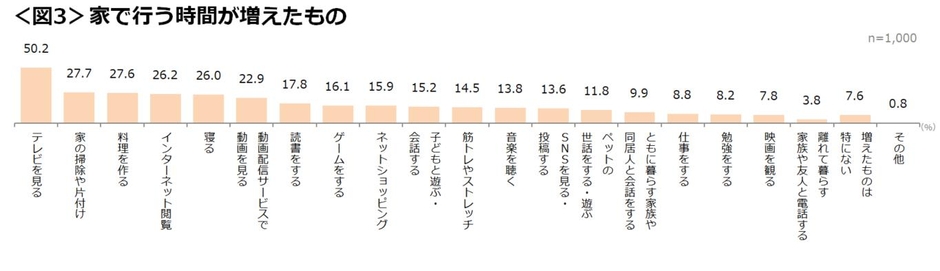 ☑ 直近1カ月のうち家で行う時間が増えたものでは「テレビを見る」(50.2%)が最も高い結果に。その他「家の掃除や片付け」(27.7%)、「料理を作る」(27.6%)など家事に充てる時間が増えている様子。<図3>