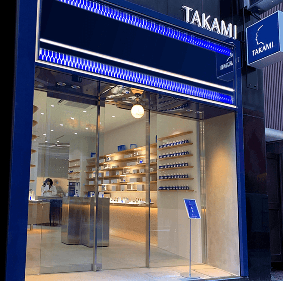 2019年12月3日(火)に東京・銀座にオープンした、ブランドの世界観や製品を直に体感できるタカミ初の路面店です。代表製品である「タカミスキンピール」をはじめとしたスキンケアライン、リップ、ボディなどのパーツケア、サプリメントまでの全製品を体感できる唯一の店舗で、美容皮膚科と化粧品会社の両側面を知る『タカミ』ならではのサービスとして、美しい肌の鍵を握る「角質」を育てるためのカウンセリングや、正しいスキンケア指導などを行う体験型コンセプトショップです。