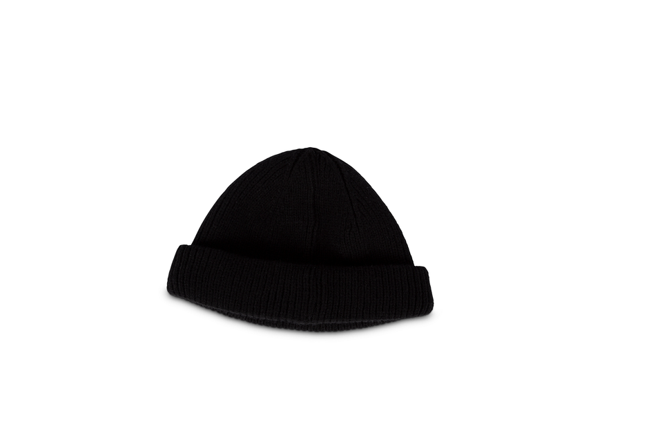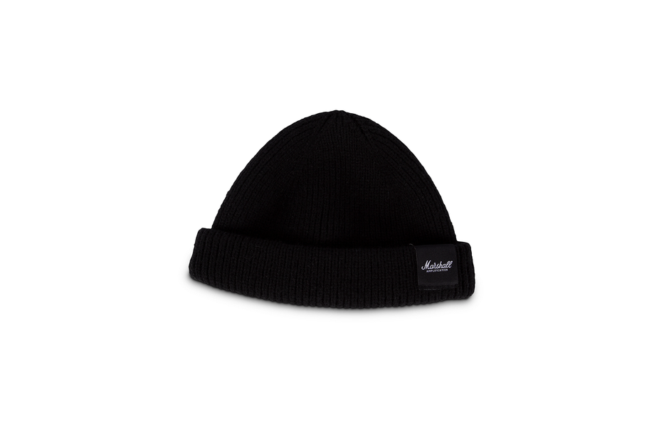 黒地に白文字のマーシャルロゴのタグが目を惹く、ソフトタッチなフィッシャーマンスタイルのニットキャップ