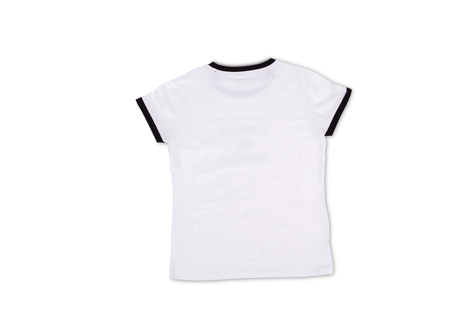 襟&袖の黒縁とシンプルなモノトーンプリントのコントラストが美しい、スタイリッシュなデザインのレディースTシャツ