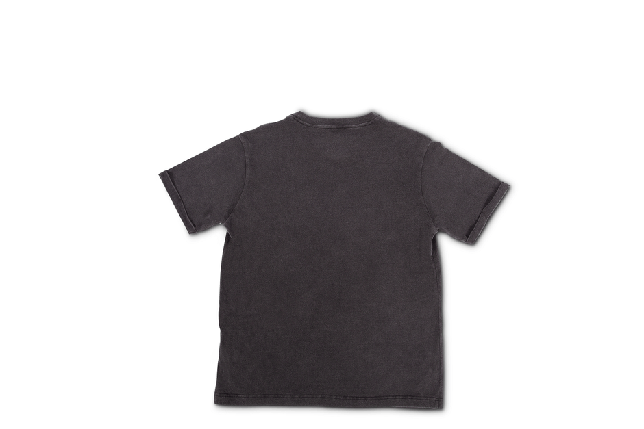 フロント胸元にワンポイントのロゴマークを配し、バックにはレトロテイストなデザインを大きく施した、男女共用デザインのリラックスフィットTシャツ
