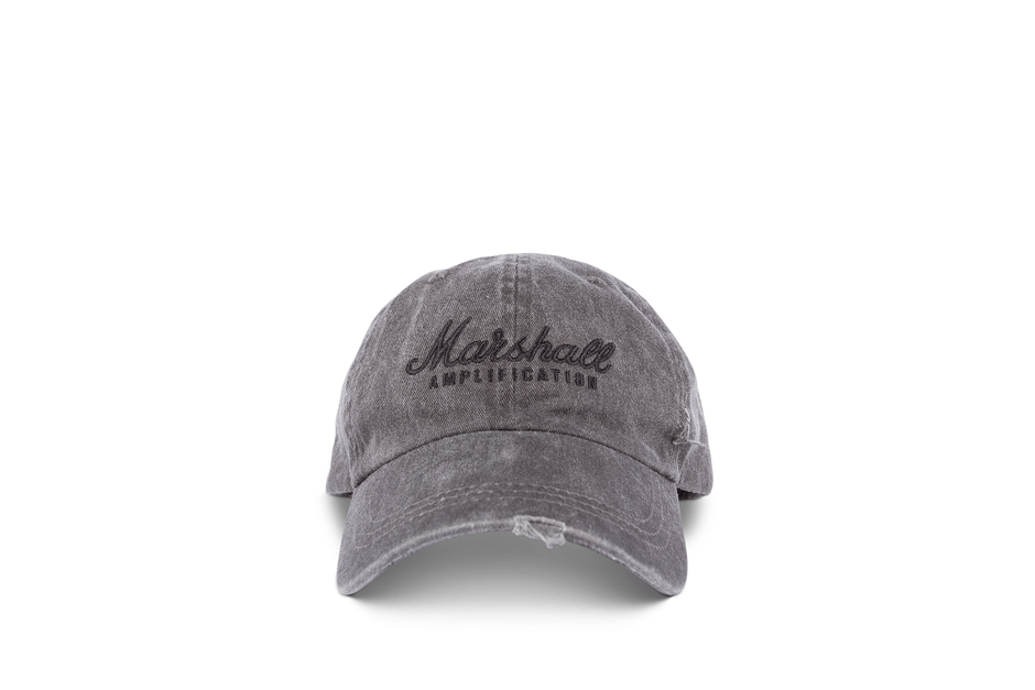 ダメージ加工を施したデニム素材にブラックのマーシャルロゴが映えるベースボールキャップ