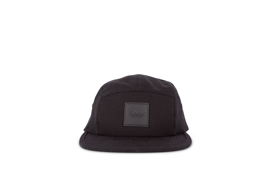 マーシャルロゴが刻まれたスクエアパネルとゴールドパーツのアクセントが際立つ、シンプルな6パネルキャップ