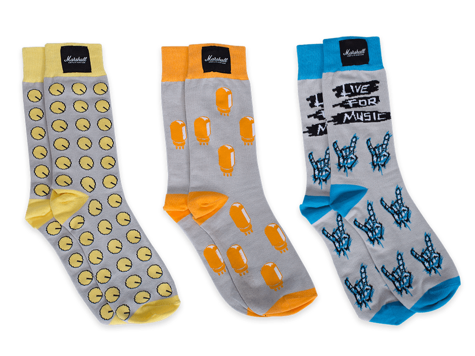 今回発売される「マーシャル」のブランドライセンス商品の新作アイテムは、マーシャルアンプのロゴデザインや製品イメージをモチーフにしたTシャツ、ソックス、キャップです。
