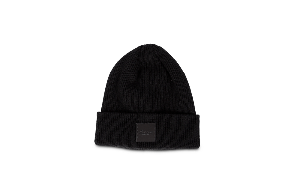 マーシャルロゴが刻まれたスクエアパネルが存在感を放つ、スタンダードデザインのニットキャップ