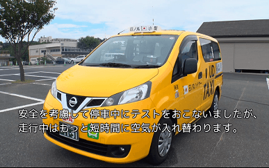 ・日ノ丸タクシー(岡周一代表取締役)のUD車両(形式 DBA-M20改(名称 日産NV250))とセダン型車両(型式 DBA-TSS10(名称 トヨタクラウンコンフォートセダン)を使用し、エアコンを使用して換気を行いました。