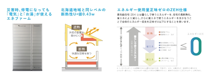 断熱性は北海道地域と同レベルのUA値=0.43Wで、寒いときは暖かく、暑いときは涼しい室内。エネファームもついており、災害時にも電気とお湯が使うことができます。