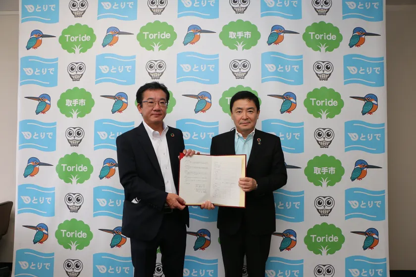 協定書締結の様子(左)一般社団法人日本ムービングハウス協会 代表理事 佐々木信博(ささき・のぶひろ)、(右)取手市長 藤井信吾