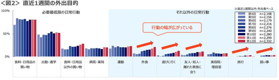「直近1週間の外出目的」においても、”必要最低限”の外出が増加しているだけでなく、「外食/遊びに行く/友人・知人・離れた家族に会う/旅行/習い事」といった不要不急の外出も長期トレンドで上昇しており、withコロナ生活に慣れ始め“行動の幅”が広がってきている状況が伺える。<図2>