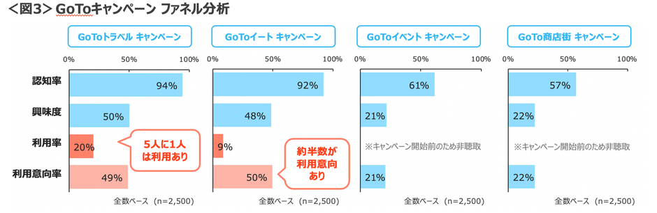 GoToキャンペーンについて「認知・興味・利用経験・今後の利用意向」をファネル分析した。認知状況は、「GoToトラベル・GoToイート」が9割と非常に高く、キャンペーン開始前の「GoToイベント・GoTo商店街」でも約6割程度にのぼる。利用状況については「GoToトラベル」が全体の20%と、5人に1人は利用しており、利用意向も「GoToトラベル・GoToイート」で全体の約半数と非常に高い関心が集まっている。<図3>直前で決められるくらいのちょっとした外出や、感染対策を十分にできると判断できた上での会食や旅行であれば出かけたい、といった気持ちが推察される。
