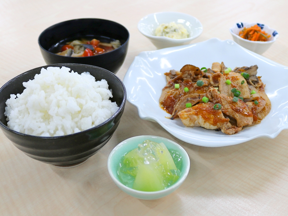 おきたま産りんごをすりおろし、爽やかな甘味をプラスした特製ソースの豚バラ炒めです。