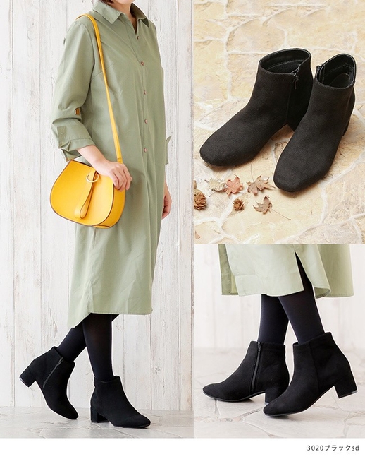 コーデに合わせやすいベーシックデザインのショートブーツ。 安定感抜群のチャンキーヒールで歩きやすさもキレイ見せも叶えてくれる。