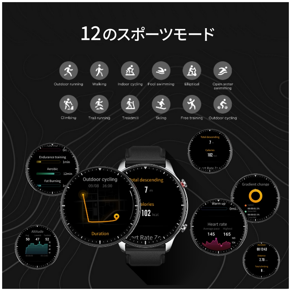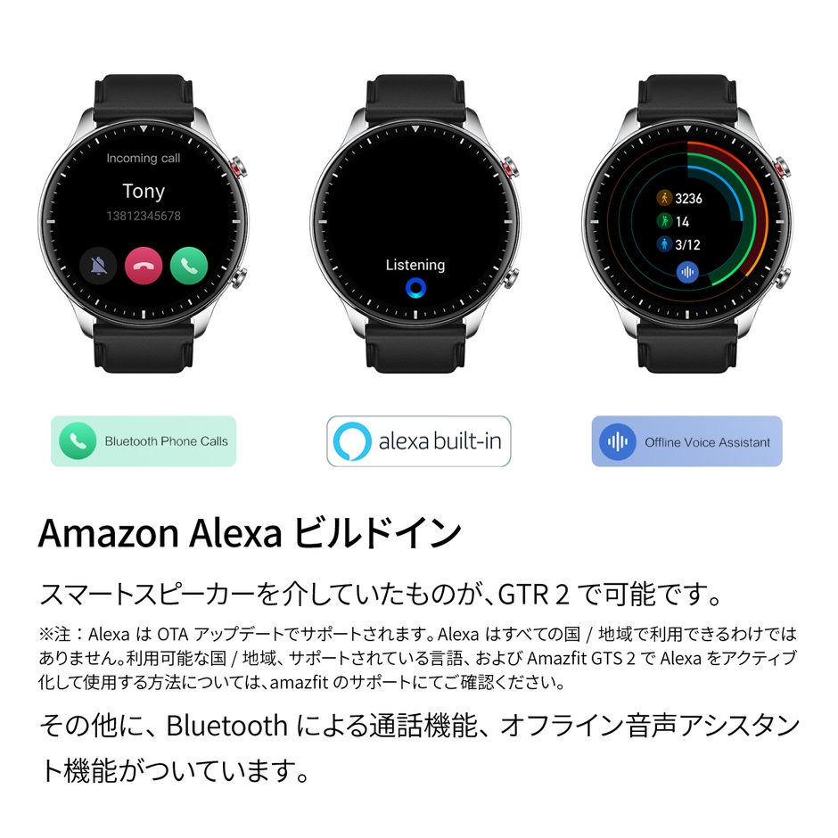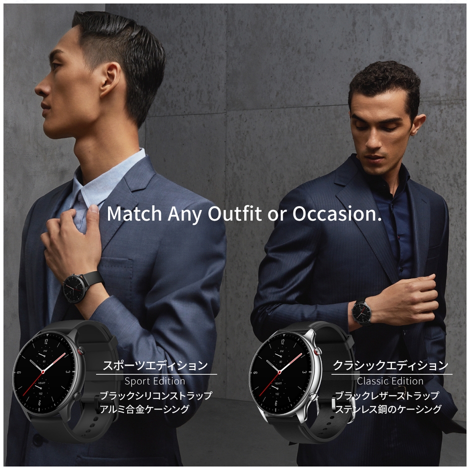 デザイン性と機能性を兼ね備えた「GTR 2」が登場。スポーツエディションは滑らかな3Dカーブのベゼルレスデザインで、シンプルなのに存在感があります。シリコンのベルトで軽くフィットネスや活動中に邪魔にならないデザインです。健康やフィットネスのモニタリングだけではなく、音楽の保存と再生も可能な多機能なスマートウォッチです。