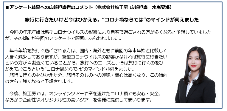 オーダーメイドの旅を提供するトラベル・コンシェルジュ・カンパニー株式会社旅工房(東京都豊島区、代表取締役会長兼社長:高山 泰仁、以下「旅工房」)は、2020年12月8日(火)~9日(水)の2日間、「コロナ禍の年末年始の過ごし方や旅行に関するアンケート」をWEBアンケート方式で実施しました。