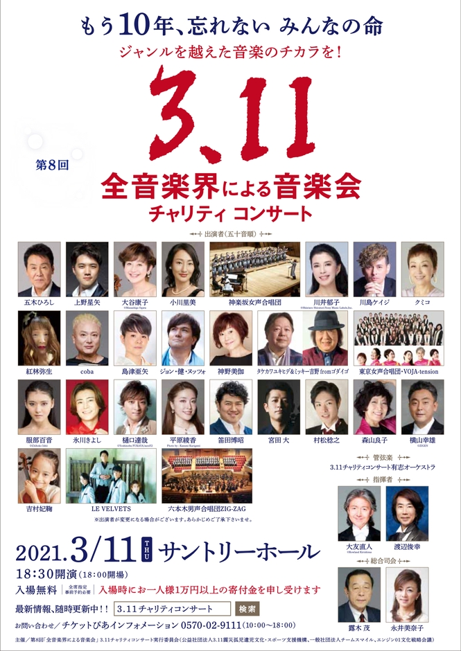 3.11 チャリティコンサート「全音楽界による音楽会」が、2021年3月11日(木)サントリーホールにて開催される。今回で第8回目となる「全音楽界による音楽会」は、2011年3月11日、東北地方を襲った未曾有の大震災の現状を見た大友直人、コシノジュンコ、三枝成彰、堤剛、林真理子、矢内廣、湯川れい子など、様々な音楽ジャンルを代表し音楽に深くかかわるメンバーが発起人となり、東日本大震災直後の4月20日にチャリティコンサートを開催したのが始まり。コンサートの入場料は無料だが、来場者一人につき1万円以上の義援金を寄付する入場の仕組みとなっており、アーティストはこの主旨に賛同してボランティアでの出演となる。さらにサントリーホールのご厚意によりホールも無料で貸し出されている。そして、かかった経費以外の寄付金の全てが「公益社団法人3.11震災孤児遺児文化・スポーツ支援機構(3.11塾)」及び「一般社団法人チームスマイル」を通じ、東日本大震災で被災した子供たちを支援するための資金に充てられている。