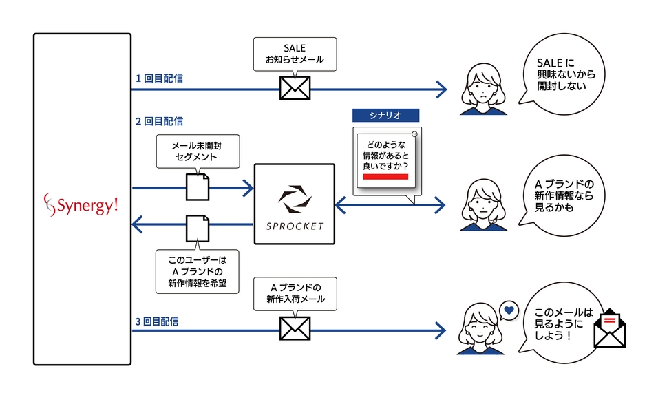 今回「Sprocket」と「Synergy!」は顧客セグメントデータやおもてなしシナリオ実行結果データを相互に連携できるようになりました。