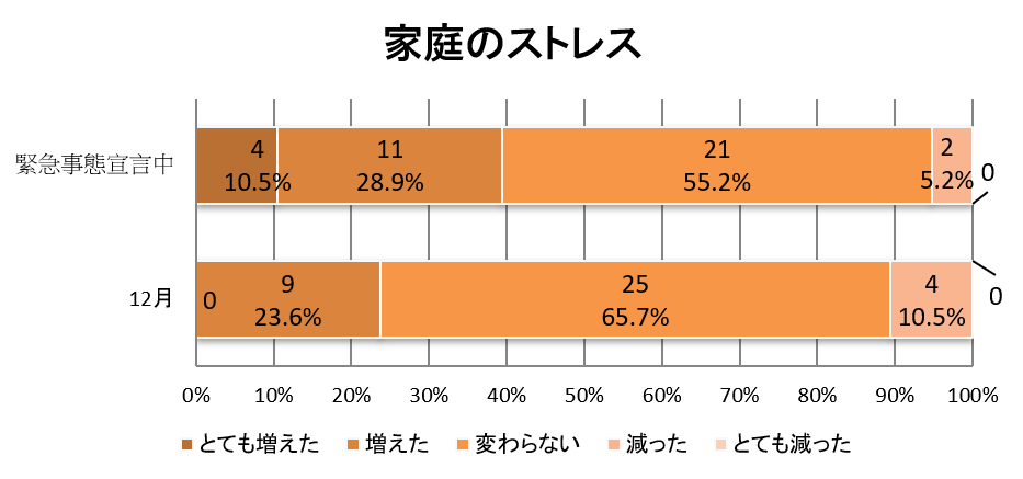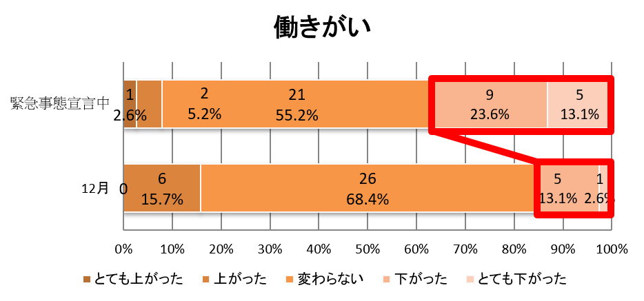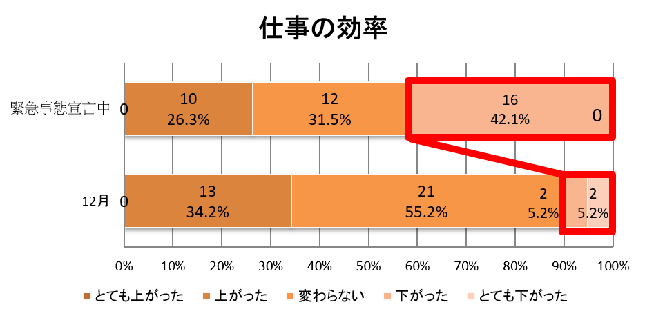 緊急事態宣言中に週4日以上の在宅勤務で「家庭のストレス」「仕事の効率」「働きがい」に課題を抱えていた人のうち、12月までに週1-3日に在宅頻度が減った後で「家庭のストレス:39.4%→23.6%(増えたの合計が減少)」、「仕事の効率:2.1%→10.5%(下がったの合計が減少)」、「働きがい:36.8%→15.7%(下がったの合計が減少)」と改善した。