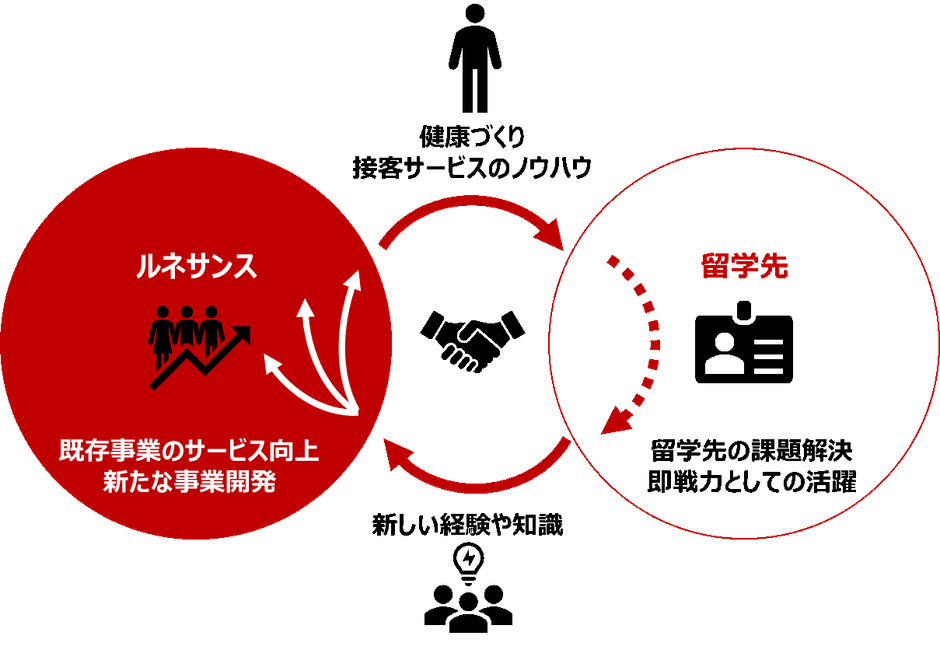 株式会社ルネサンス(代表取締役社長執行役員:岡本 利治、本社:東京都墨田区、以下「当社」)は、新たな事業開発を目的として、当社と親和性のある企業・専門学校・介護施設・自治体など(以下「留学先」)へ、一定期間従業員を派遣する「事業開発型社外留学制度」を導入したことをお知らせします。