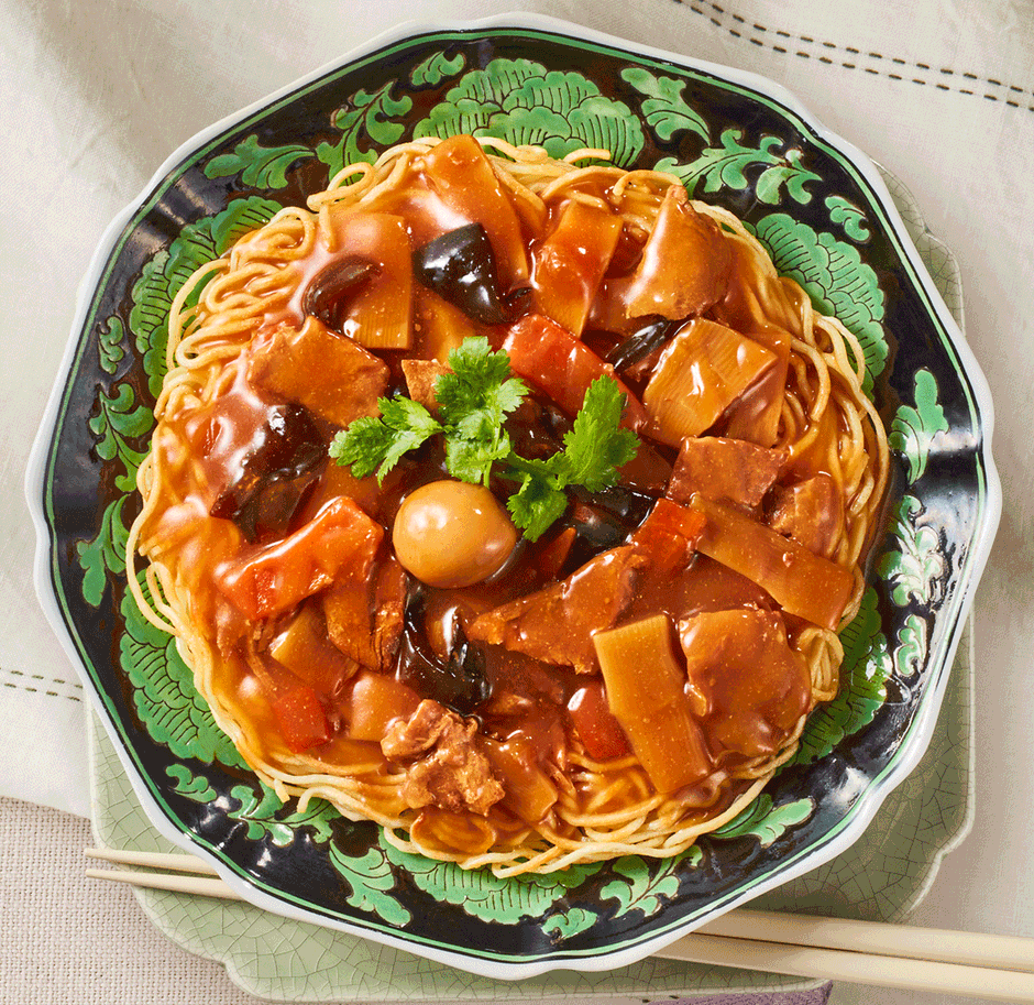 SONOKOの麺を代表する「らーめん風」。普段はらーめんとしていただきますが、フライパンで固く焼いて焼きそば風にアレンジ。オイルを使わないカラダにやさしい「中華丼」をかければあっという間に子どもも喜ぶ固焼きそばに。