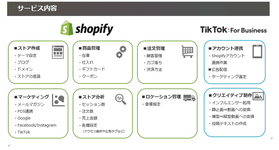 ソーシャルコマースの需要に対応するため、これまでの実績を活かし、TikTokでのクリエイターの起用、広告出稿からShopifyのサイト構築までのトータルサポートを提供してまいります。