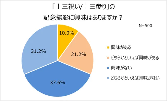 そして、子どもの凛々しい和装姿をしっかりと思い出に残すことができる、「十三祝い/十三参り」の記念撮影についても質問しました。「興味がある」と答えたのは、「興味がある(10.0%)」「どちらかといえば興味がある(21.2%)」を合わせて31.2%となり、3人に1人が興味を持っていることが明らかになりました。