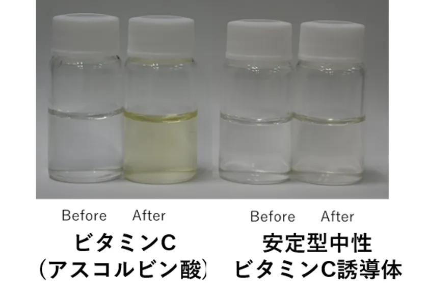 当社の安定型中性ビタミンC誘導体は、傷口に入っても痛くない低刺激で、かつ安定性に優れ、常温で長期保存を可能にした点が特徴です。