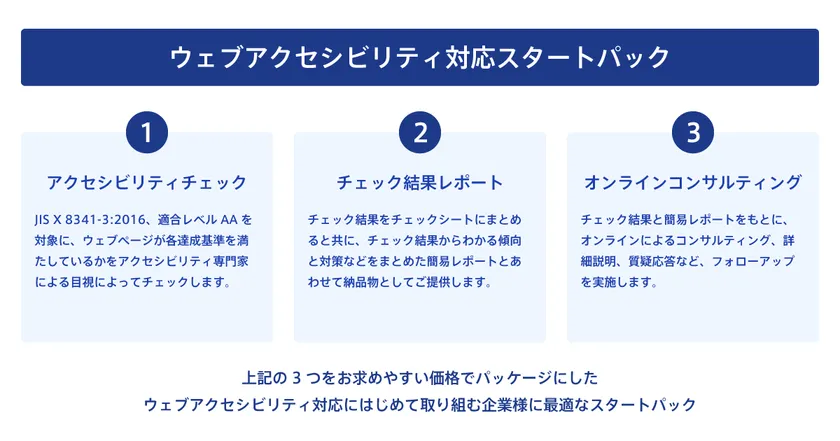 そこで、現状把握のための「アクセシビリティチェック」と、その結果をまとめた「レポートの作成」、およびその結果を踏まえて実施する「オンラインコンサルティング」という、ウェブアクセシビリティ対応のはじめの一歩として最適な内容を、わかりやすい価格体系でパッケージ化することで、はじめてウェブアクセシビリティに取り組みたいという企業でも、導入しやすいスタートパックとして提供することとしました。