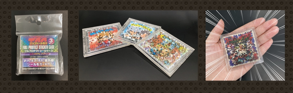 累計販売売上枚数が100万枚を突破したフルプロテクトスリーブ。 今回、これまでになかった食玩シールにぴったり合う専用ローダー、 <フルプロテクトシールケース>を発売いたします。 6月30日より河島製作所楽天市場店より数量限定先行販売 価格は3枚入り税込330円です。