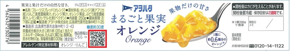 ・250gは1瓶に約0.6個分のオレンジ、125gは1瓶に約0.3個分のオレンジを使用しています(オレンジ1個200gで換算)。