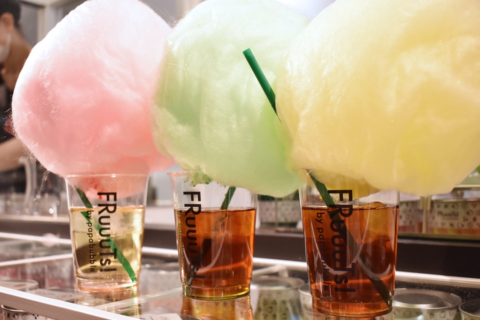 昨年末、世界に先駆けて横浜高島屋のフーディーズポート2にオープンしたパパブブレの新ブランドFRuuuTs!(フルーーツ!)では、国内・海外のいずれの店舗でも未発売の新感覚スイーツ「コットンキャンディ」を店内で実演製造し、提供しています。