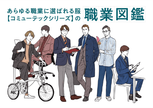 今回の「職業図鑑」は、職業別のコーディネートを提案することで多様化するビジネスウェアの着こなしをサポートします。このコンテンツでは“あらゆる職業に選ばれる服”をテーマに、「COMMUTECH(コミューテック)」シリーズでコーディネートしました。「COMMUTECH」はセットアップスーツからカジュアルまでバリエーションが豊富なうえに、ストレッチや防シワなどの機能性を備えたアイテムです。コンテンツ内のコーディネートは全17業種で、不動産会社や保険会社などの比較的フォーマル度の高い着こなしから、フォトグラファーや美容師などのカジュアルな着こなしまで幅広く掲載をしています。それぞれのコーディネート解説やポイントをチャートにする他、モデルの身長や着用サイズを表示するなど、よりリアルな着用イメージを持てるように工夫を施しました。また、実際にその職業で働いている方にもモデルとして出演いただき、ヒアリングを参考にコーディネートを組んでいます。
