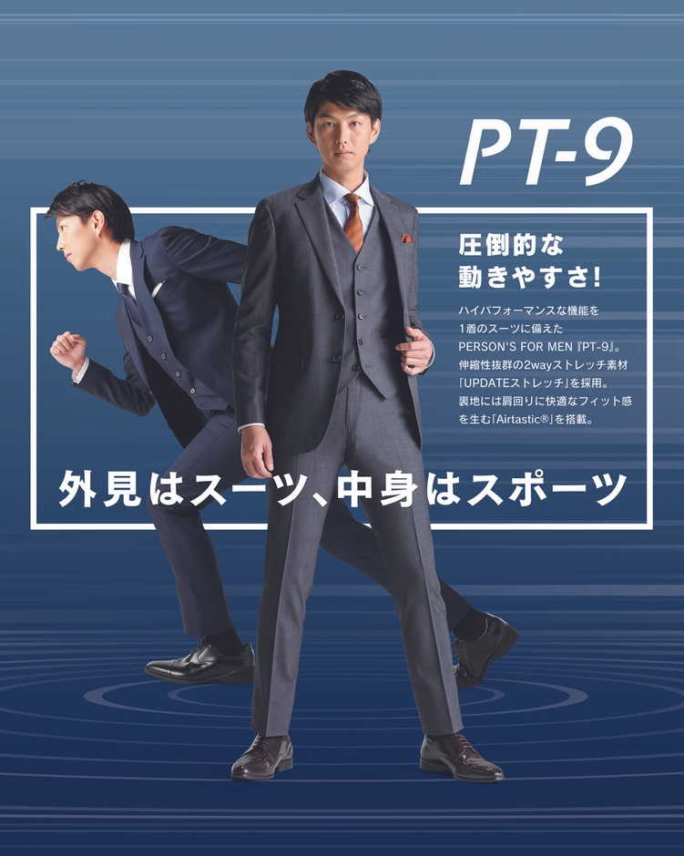 「PT-9」は、“外見はスーツ、中身はスポーツ”をコンセプトとしたスタイリッシュスーツの主力商品です。上品でフォーマル感のある本格的なスーツスタイルでありながら、各所にストレッチ素材を使用するなど動きやすさにこだわったスーツとして、活動的なビジネスパーソンを中心に絶大な支持をいただいております。