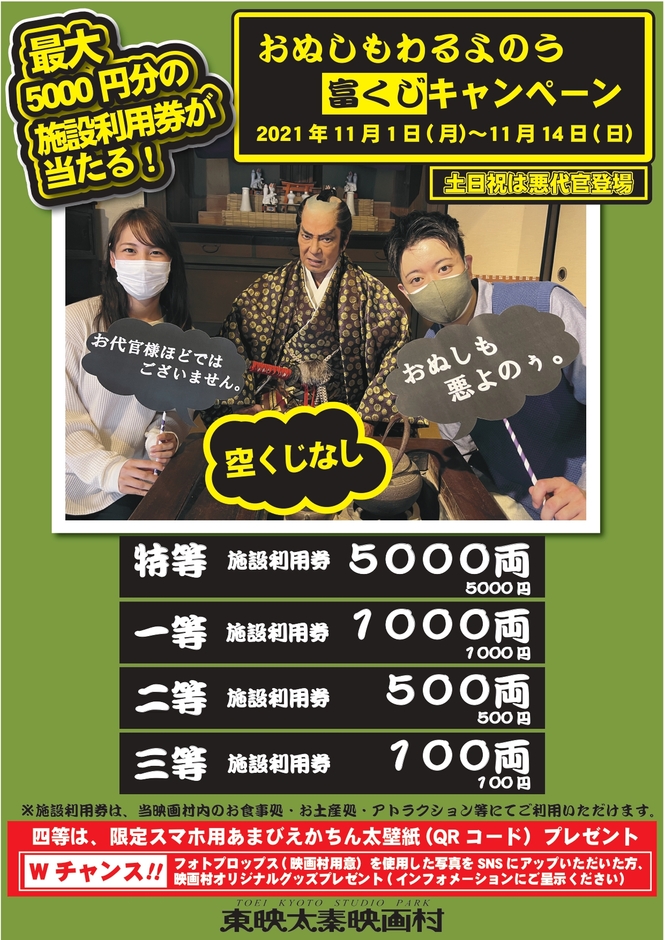11月1日の映画村 創立記念日に合わせ、お得に楽しくお楽しみいただけるハズレ無しのクジ引きキャンペーンがスタート