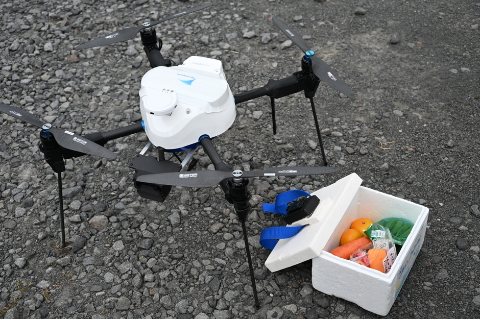 本実証実験では、第1回目の実証を10月20日に実施し、その際は現在町民向けの買い物支援事業として運営されている移動販売車「きよら号」での配送をドローンに置き換えた場合を想定し、ドローンを活用しての食材等の配送を行いました。