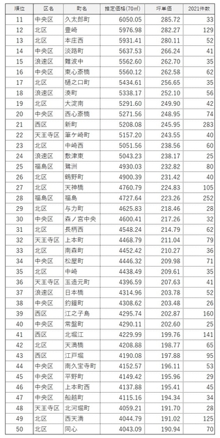 ・1位は「北区大深町」の1億3,513万200円。JR大阪駅(梅田)北側の再開発エリア「うめきた」内の町名で「グランフロント大阪オーナーズタワー」があり、推定価格が唯一1億円を超えた。